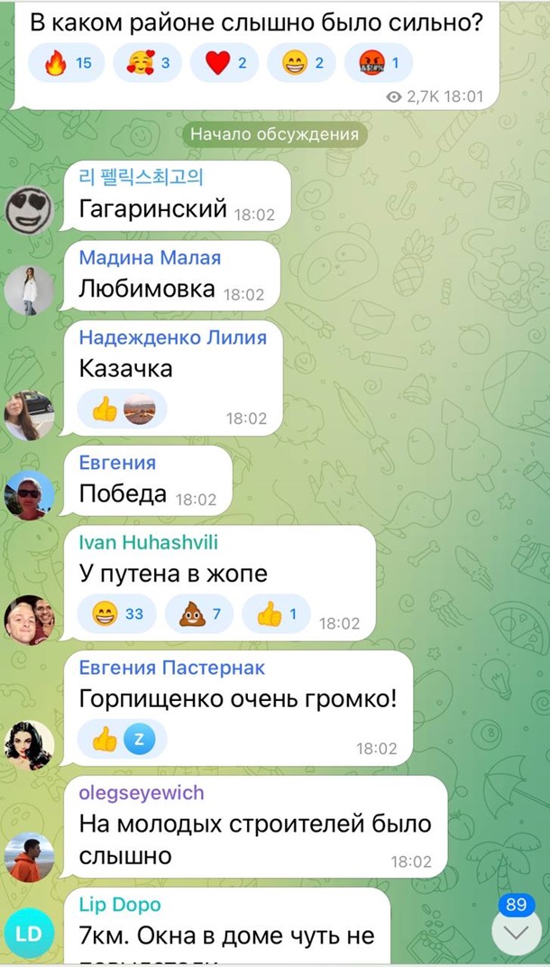 Добре чути вибухи було у Байдарській долині. У Севастополі найдужче гриміло у мікрорайонах “Хрусталі”, (там очевидці повідомляють, що “щось летіло з боку Бельбека), Острякова, Льотчиків (у районі Юмашева) на північній стороні, у районі ЦУМу, на Артилерійській бухті.